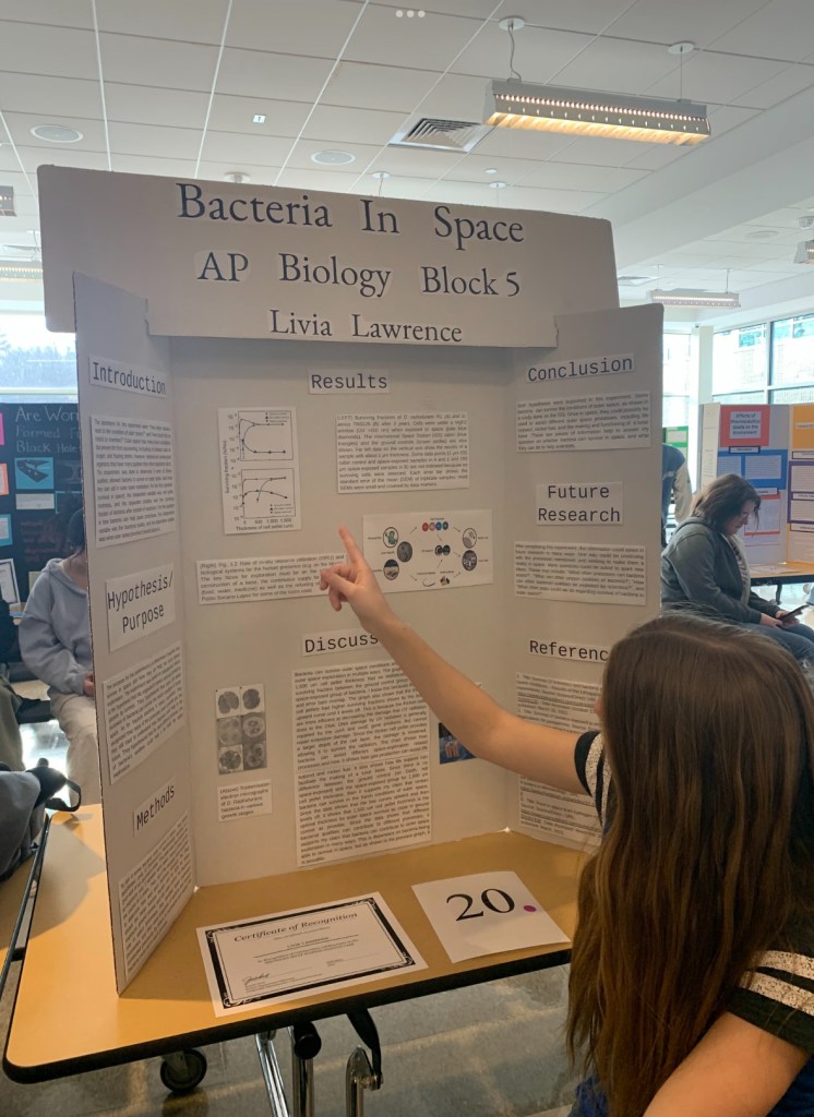 Sophomore Livia Lawrence, Participant (Bacteria in Space): “It was really cool to see all the different branches of science!”