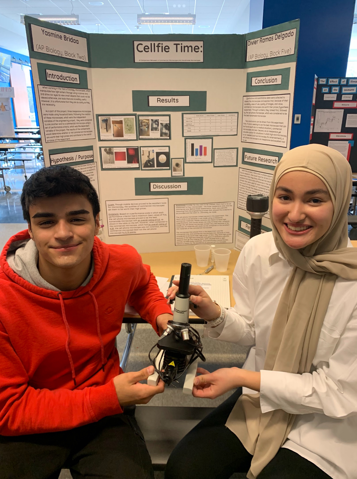 First Place Team Science Fair Project: Yasmine Bridaa and Divier Ramos Delgado, “Cellfie Time: A Comparison Between a Commercial Microscope and Handmade Microscopes”